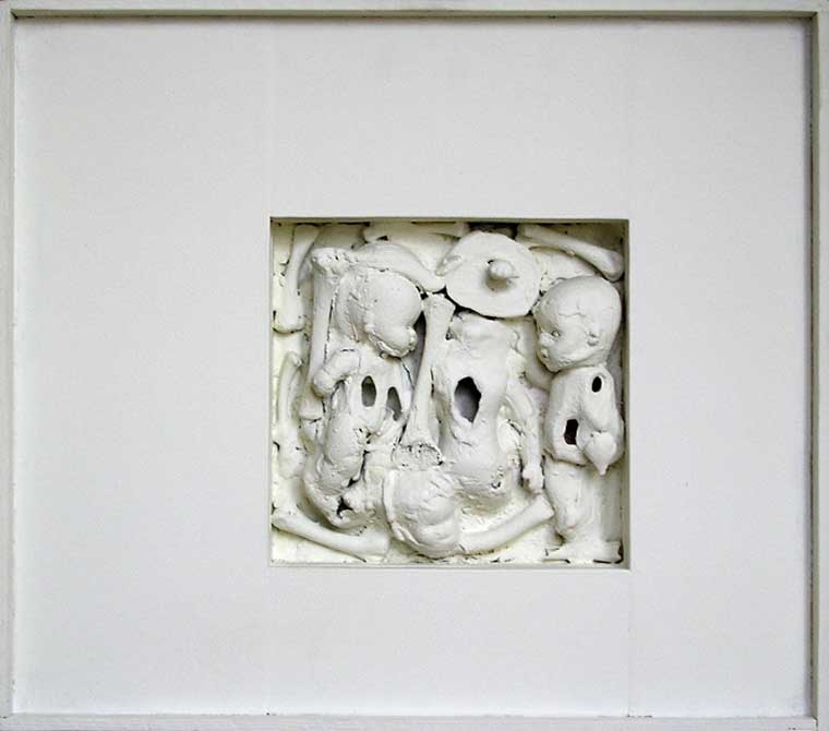 45x40cm, baby dolls, bones, wax, acrylics, on wood
